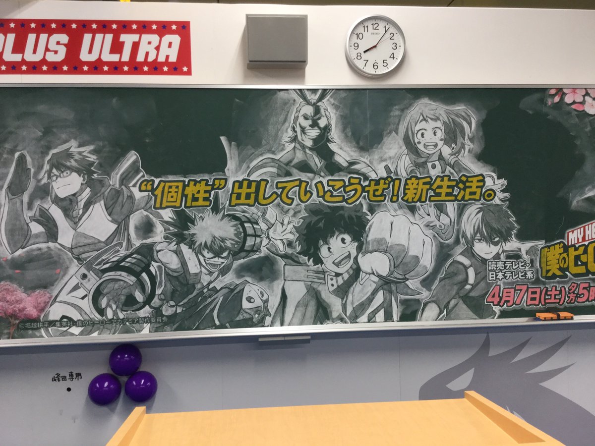 新高校3年生になるクラスに、ヒロアカの黒板アート&キャラからのメッセージでサプライズエールを贈り、先生かのように教壇でお話してきました!高校生のみんな、ヒロアカ大好きでいてくれてる子がすごく多くて、こちらがびっくりするくらい喜んでくれたので、感動しました…#heroaca_a #ヒロアカ