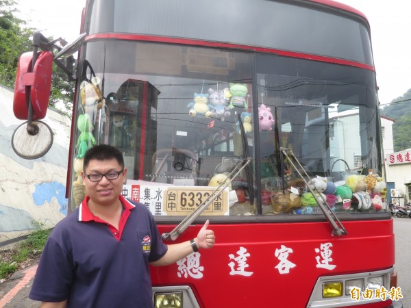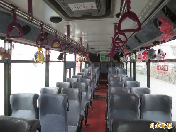 南投總達客運司機陳泳程在公車內布置娃娃玩偶,琳瑯滿目的娃娃讓乘客直呼好療癒。(記者劉濱銓攝)