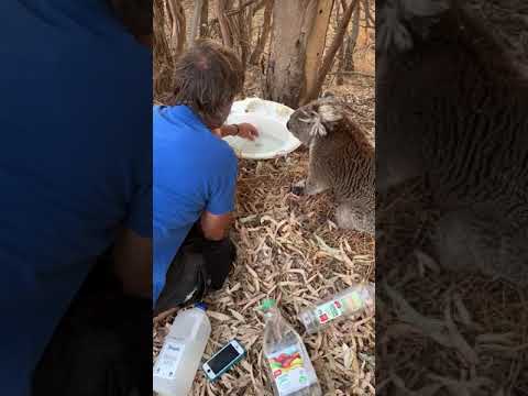 Facing drought with a river system in chaos and not enough native eucalyptus trees to get their natural moisture source from this sweet little koala drank from a water bottle while we were doing our best to encourage it to move toward the sink we provided so it could cool its paws in the water.