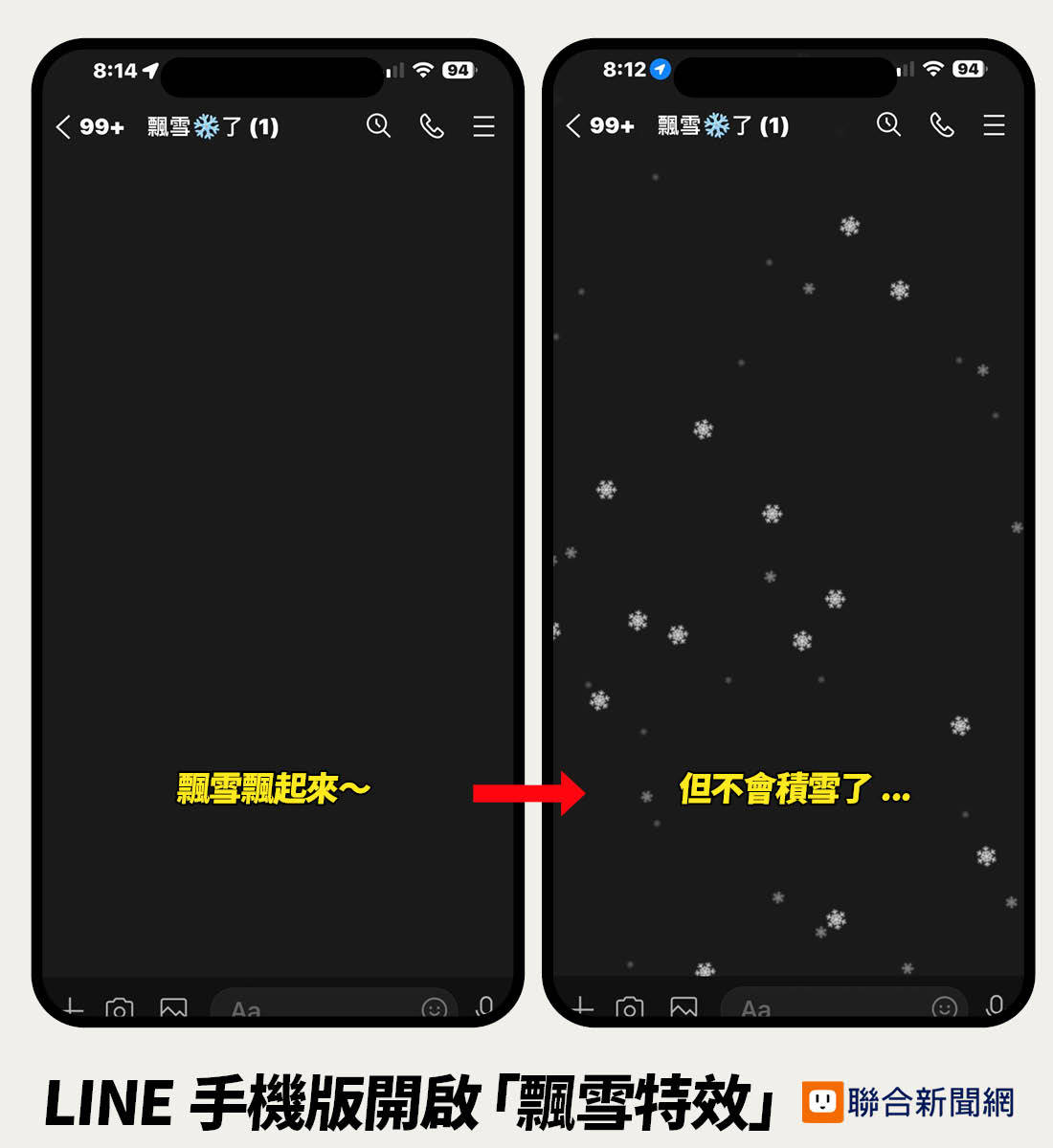 LINE即起推出「1日限定」聊天室飄雪特效,要讓大家感受到冬日氛圍,可別錯過時間囉!(製圖/聯合新聞網)