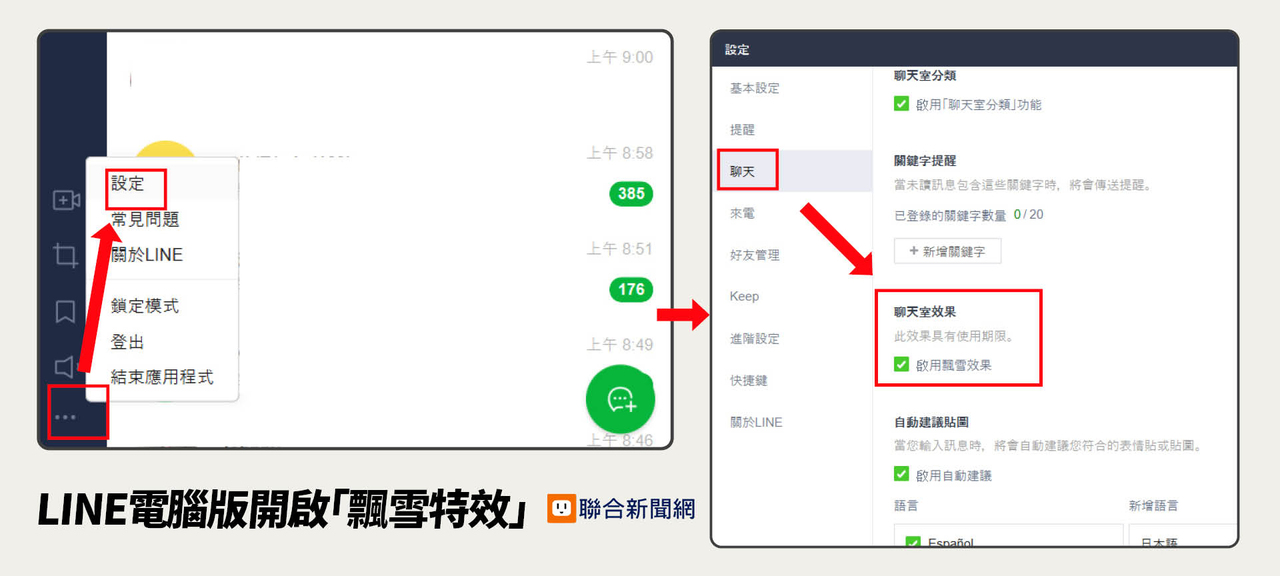 若仍看不見飄雪,可從右上角「設定」→聊天→開啟「聊天室背景特效」,就能看見聊天室背景在下雪囉