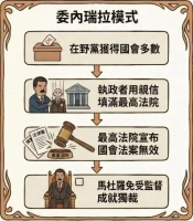 (nicolaschen2.) 委內瑞拉獨裁政府四部曲: 1、一開始先是國會選舉選輸變國會少數黨。 2、提名一堆自己人填滿最高法院。 3、接下來自己人的最高法院宣布國會法案無效。 4、最後開始為所欲為,實質獨裁。 我怎麼覺得委內瑞…
