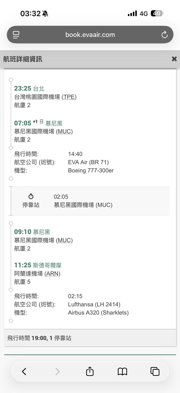 預計搭乘(長榮)台灣-慕尼黑,轉(漢莎)慕尼黑-斯德哥摩爾,這是我長榮查到的機票,