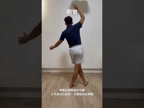下半身的擺位相同,右手高舉過頭往左延伸,同時左手水平高度向右延伸,