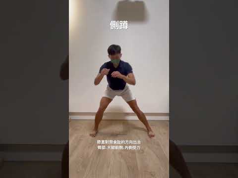 雙腳站兩倍肩膀寬,往右側蹲下時,右大腿、小腿對齊食趾的方向出去,