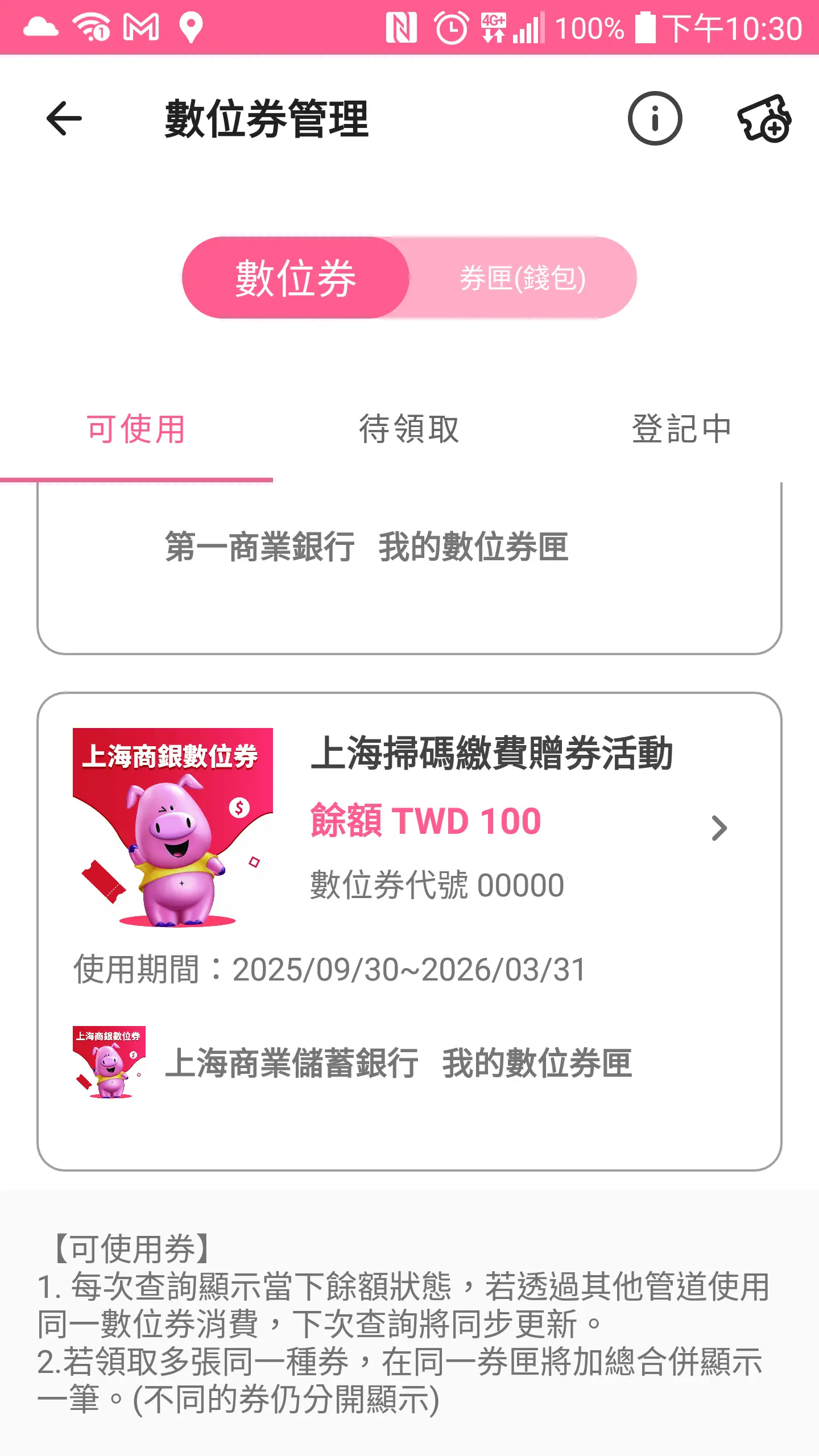 → SophiaH: 都是TP app, 原來數位券還有分 直接入券、待領取啊.. 剛發現華南的券不知躺在待領取多久了43F 10/01 20:53
