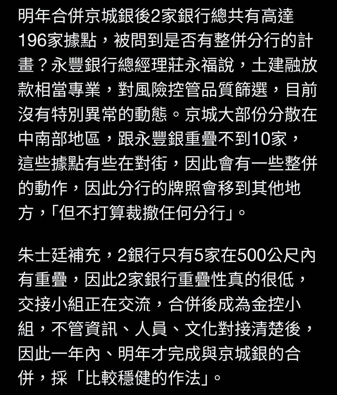 ,若是單靠永豐銀十年努力,無法在南部有那麼多的據點與客戶,合併京城銀行之後,除