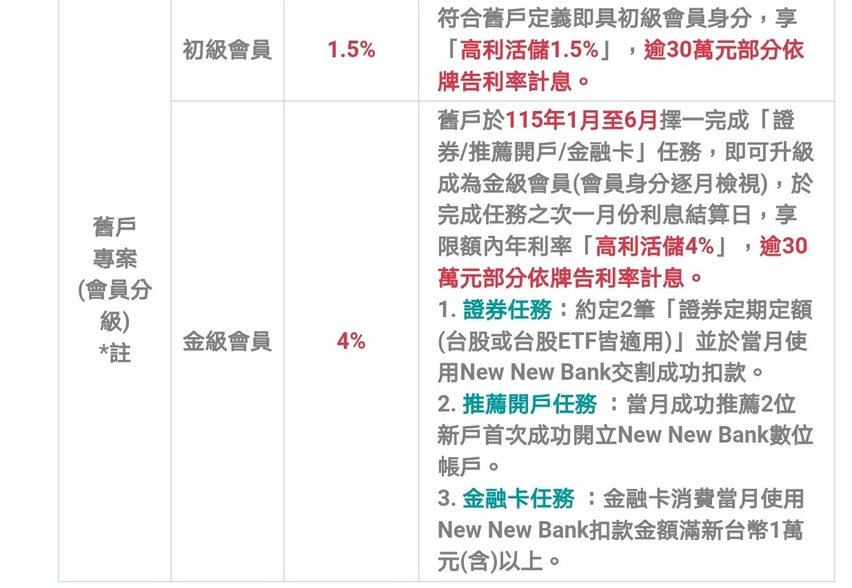 萬 *15% 除12個月),第二個月起領息時,轉換成為舊戶身分,每月只要完成指定任務,
