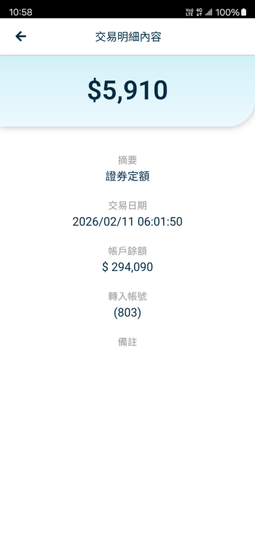 T+2日解圈扣帳,2/11 New New Bank帳戶交易明細顯示一筆「證券定額」扣款交易。
