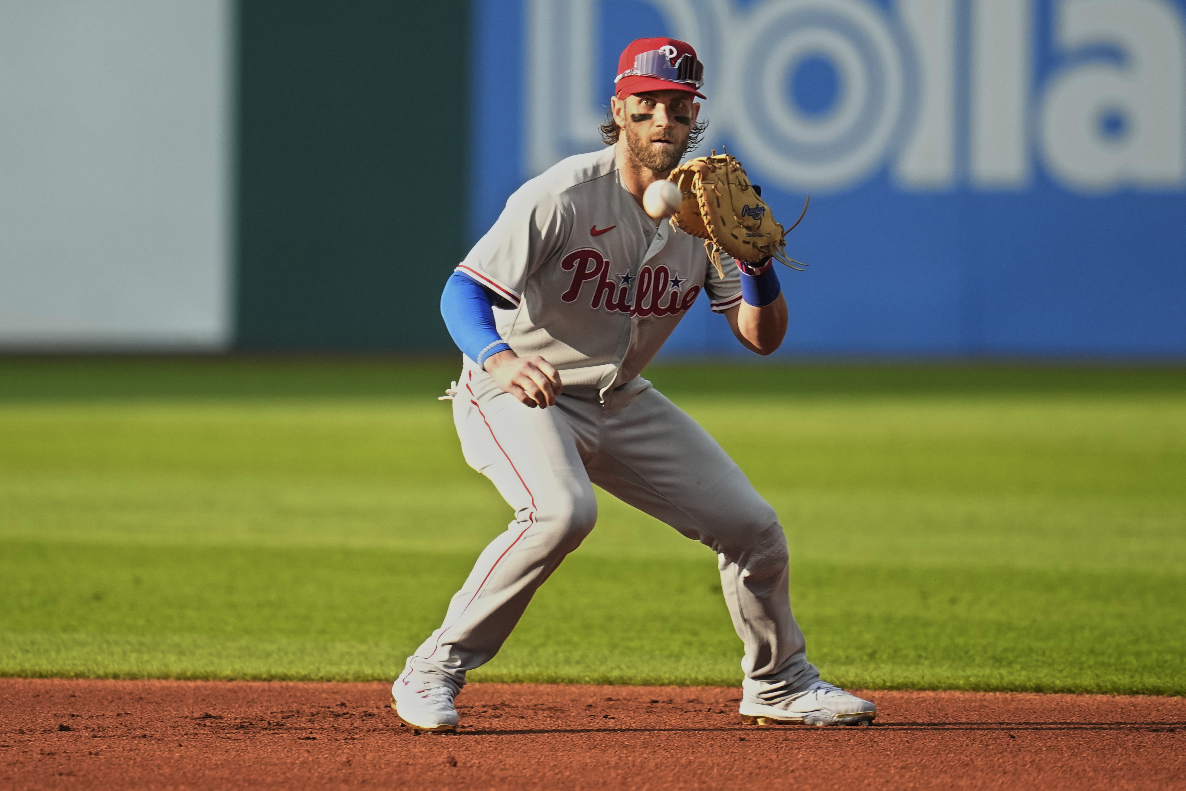 來到費城Harper前次以一壘手身分出賽是2021年5月8日,當時和亞特蘭大勇士鏖戰到12局
