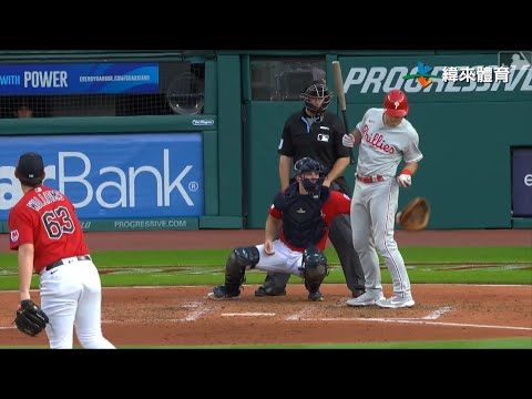 費城人與守護者一戰的3局上半出現奇妙一幕,費城人捕手J.T. Realmuto在打擊時喊了暫