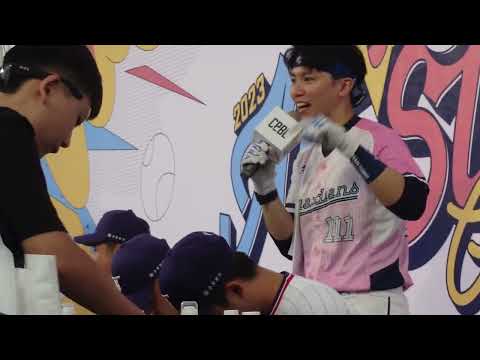 在選手簽名時,阿崔訪問靖凱對於阿坤全壘打大賽會是如何