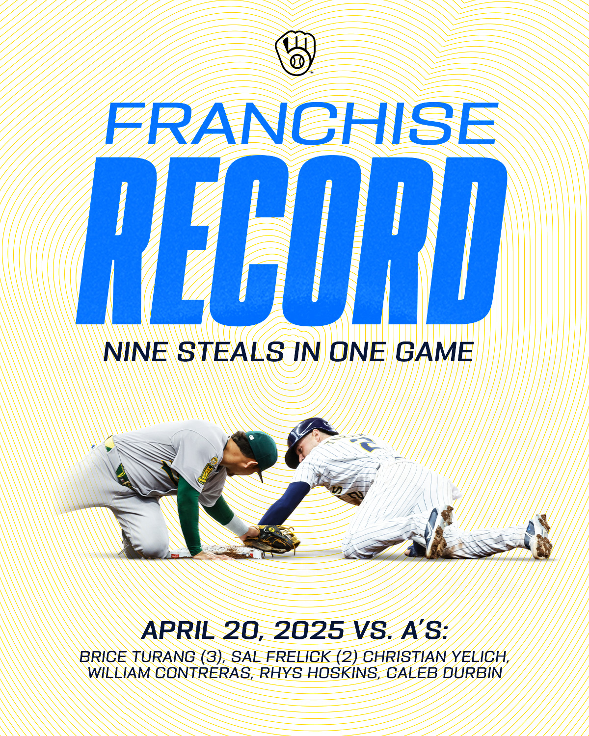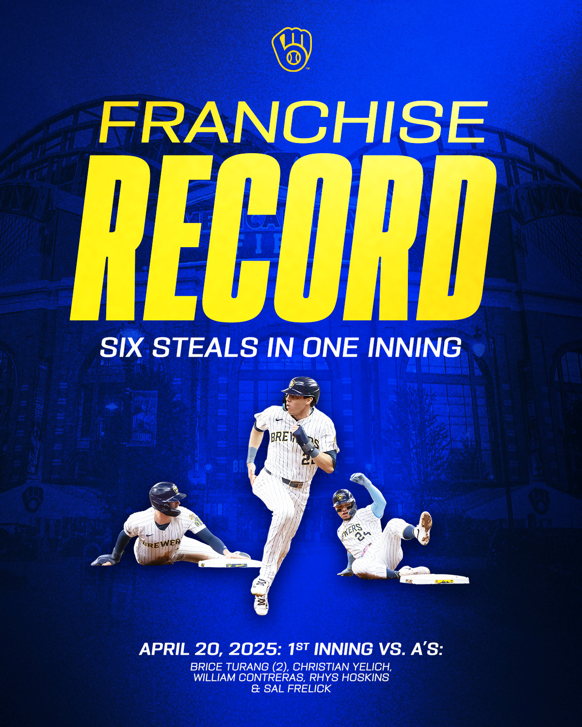密爾瓦基釀酒人在今日對上運動家的比賽中跑出單場9盜/單局6盜的創舉