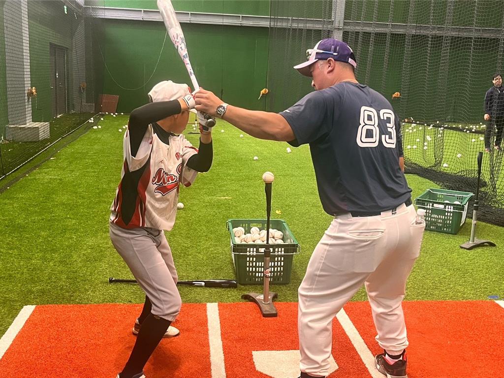 韓國職棒樂天巨人隊到台南市春訓,該隊教練指導台南市青少棒選手打擊技巧。(台南市