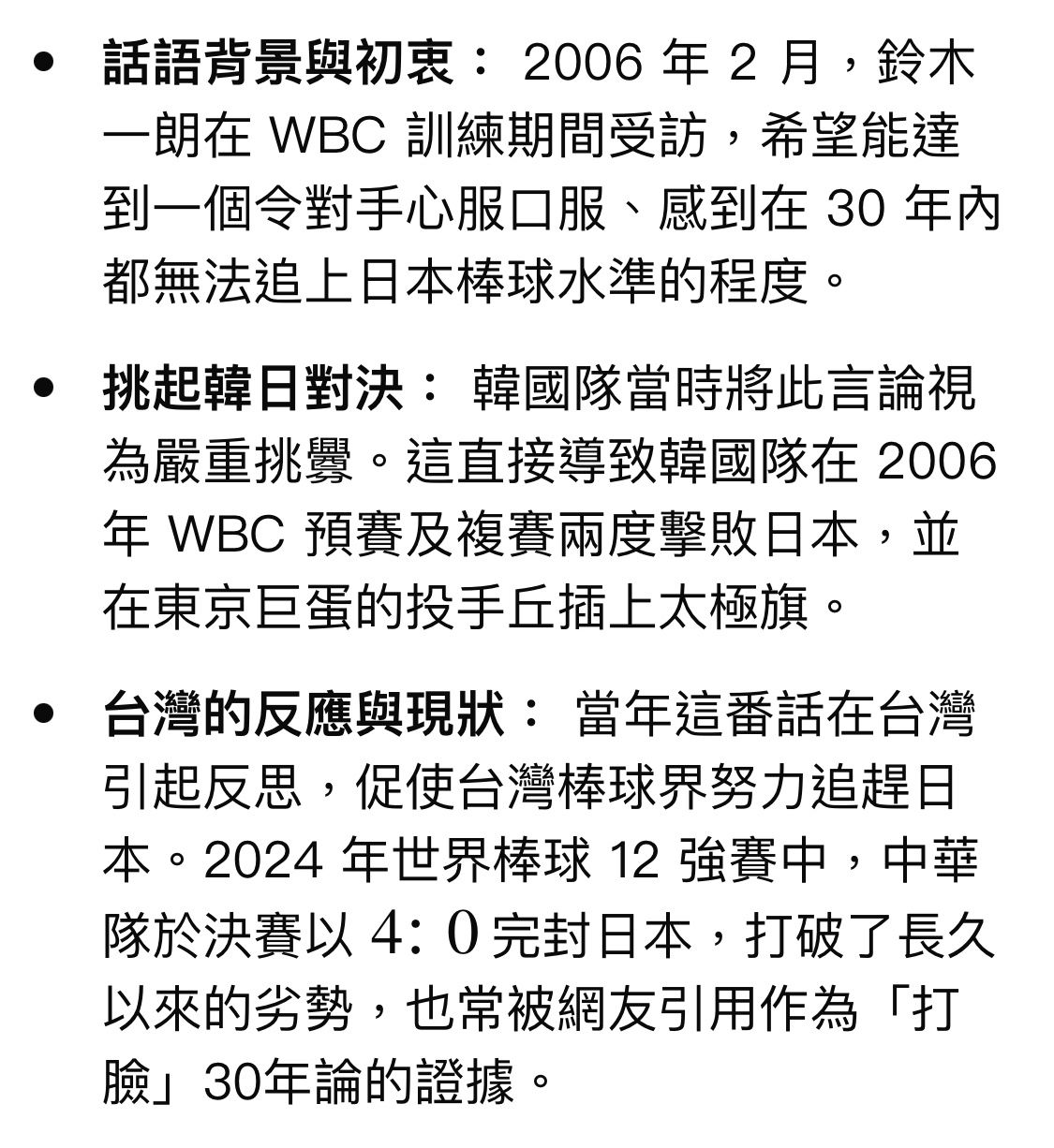噓 kashnes: 鈴木一郎那叫鼓勵自家球員喔,不用舔成這樣吧,台灣就是對日可悲到連對戰態度都沒有才會只能玩數學棒球,去看看當時韓國贏球後插旗時全日本隊只有鈴木一郎在不爽而已,因為韓國隊就是針對鈴木一郎,其他日本隊友氣氛超尷尬,一副又不是我嗆的,那屆經典賽雖然最後日本贏下韓國,但整個系列賽韓國是贏2次日本,日本只是贏了面子但是輸了裡子,鈴木一郎都承認這次經典賽是他棒球生涯中最恥辱的一次77F 03/14 15:49