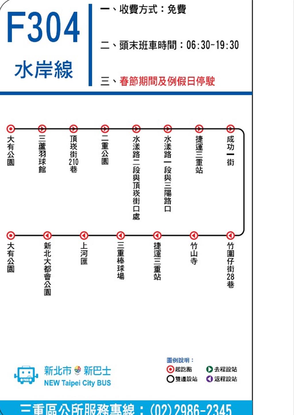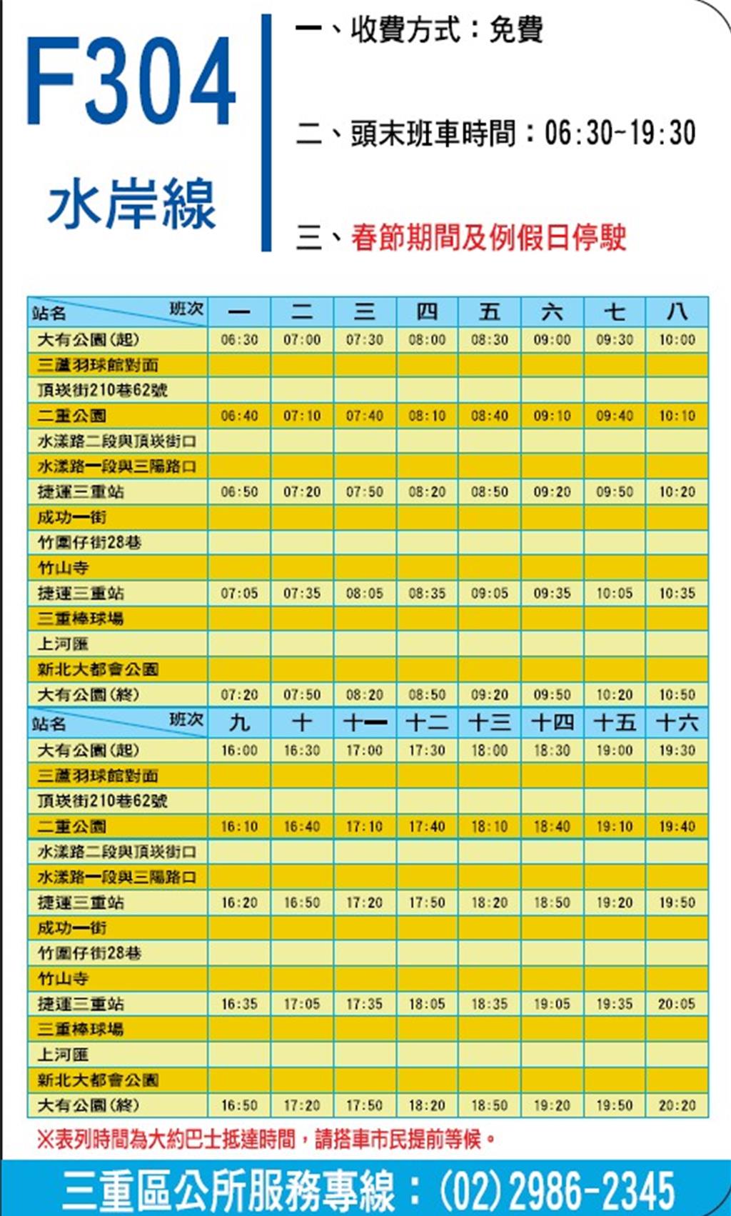 新巴士F304水岸線班次時間。(三重區公所提供)