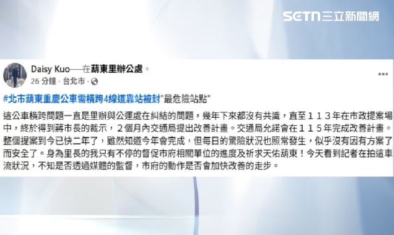 在地郭姓里長也PO文,說北市葫東重慶路口是最危險站點,因為車流頻繁,公車下引道後
