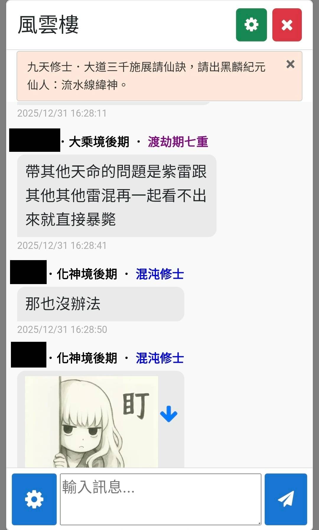 聊天室中除了與其他道友聊天,也可以使用貼圖、上傳圖片、邀請與他人對戰。
