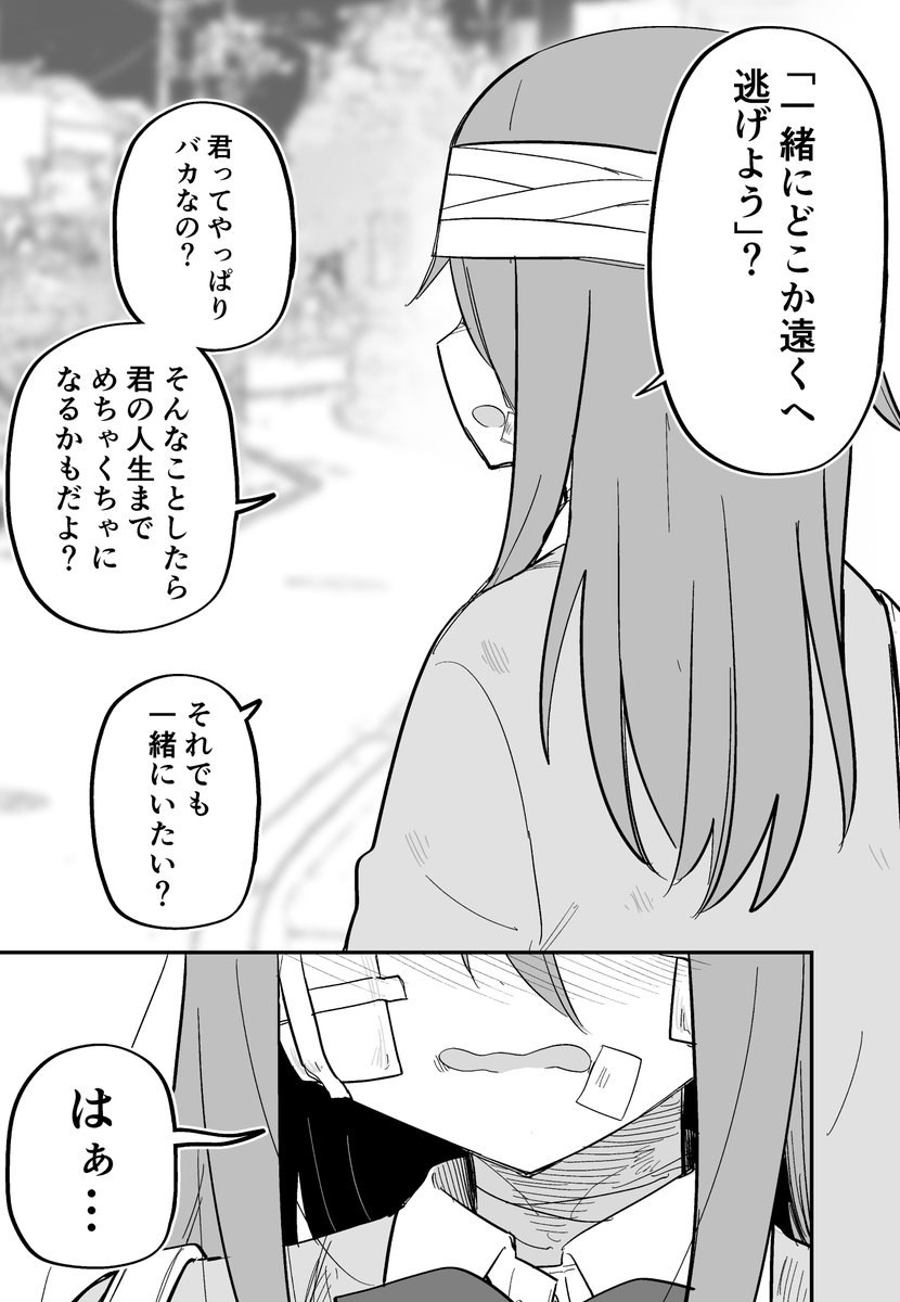 : 「『一起逃得遠遠的吧』?你果然是個笨蛋吧?這樣做可能會讓你的人生一團亂喔?即便這樣也要跟我一起嗎?哈啊…」