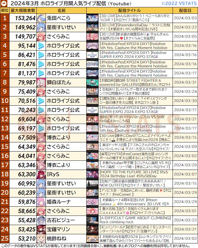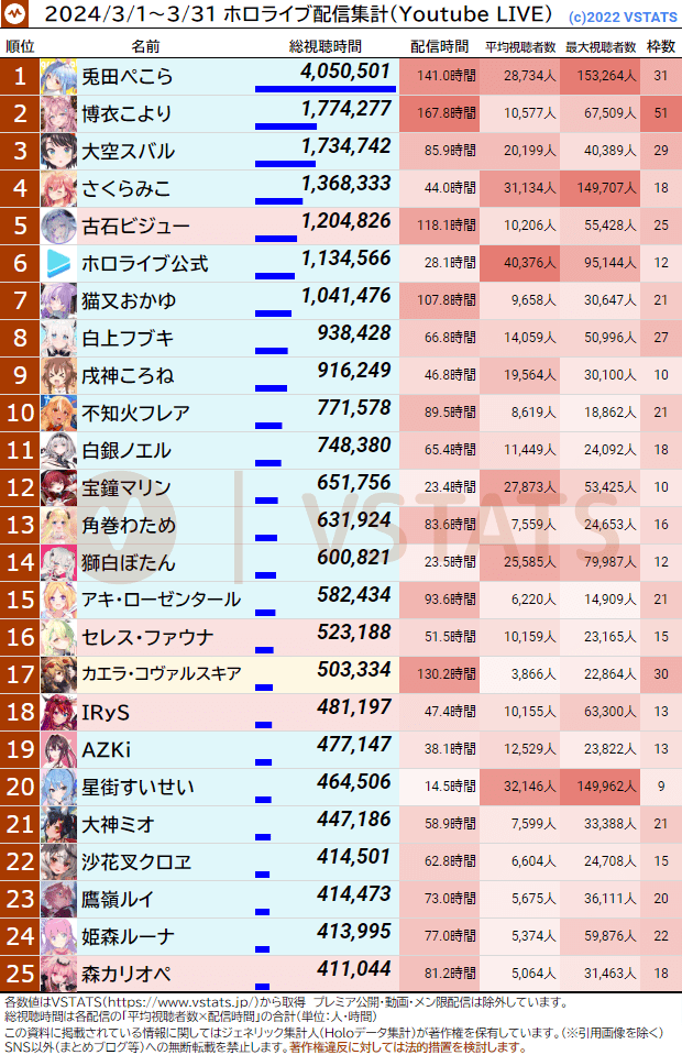[Holo] Hololive 2024年3月份 直播&觀看時數統計