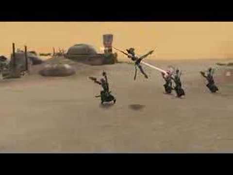 博被他們團團圍住,用槍尾的能量鐮刀反擊。他殺了四個,但最後還是沒能躲過從四面八