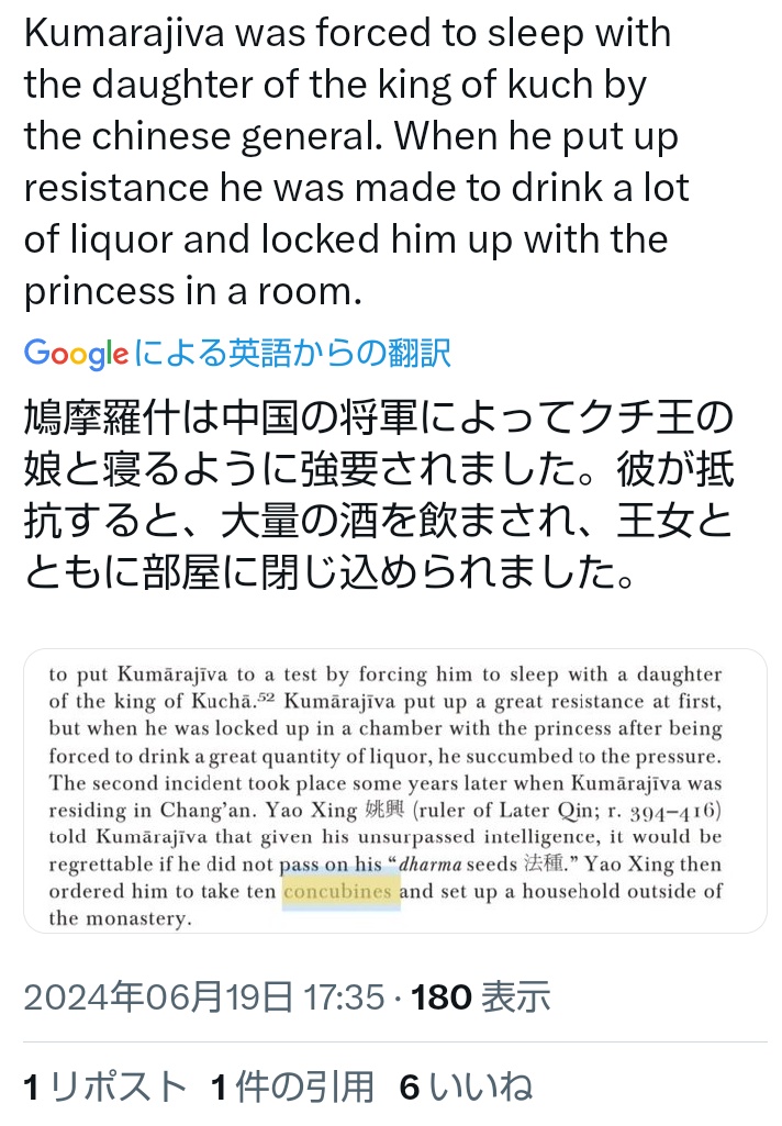 Kumarajiva was forced to sleep with the daughter of the king of kucha by the