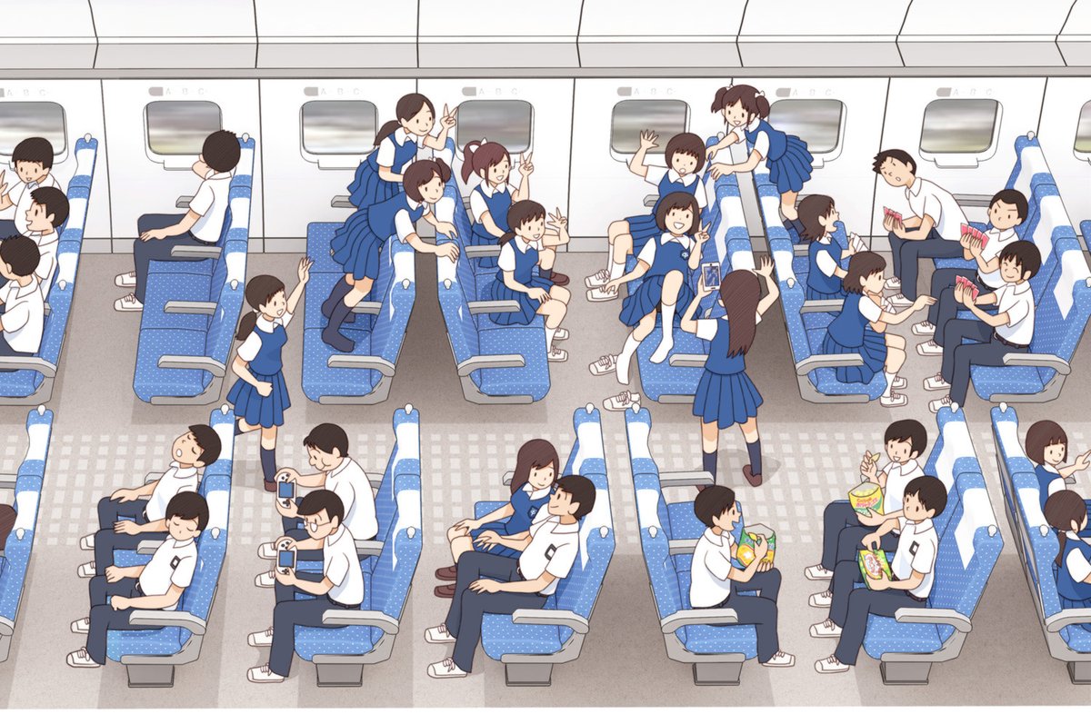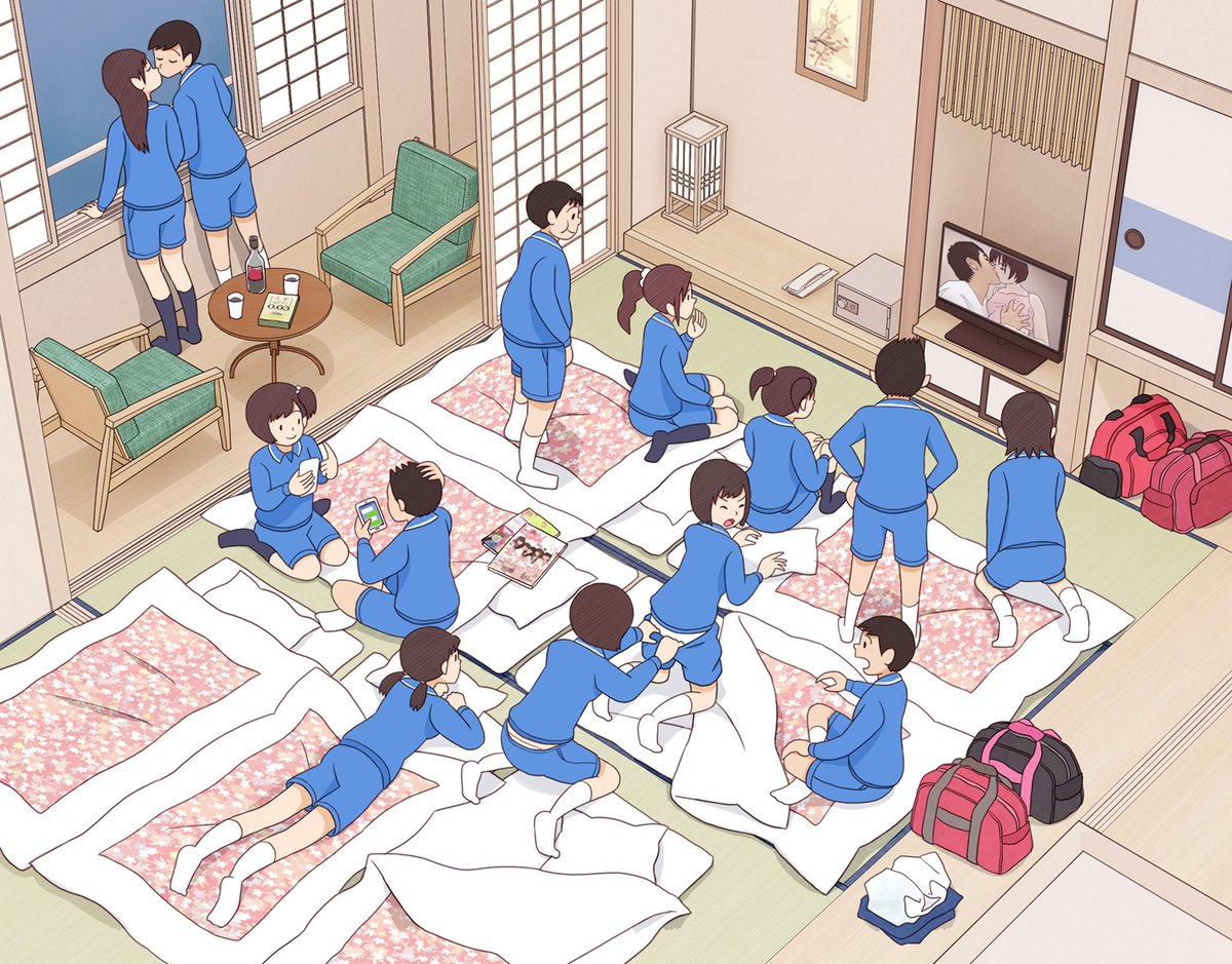 共計兩張全彩畫的主題是"有趣的修學旅行"