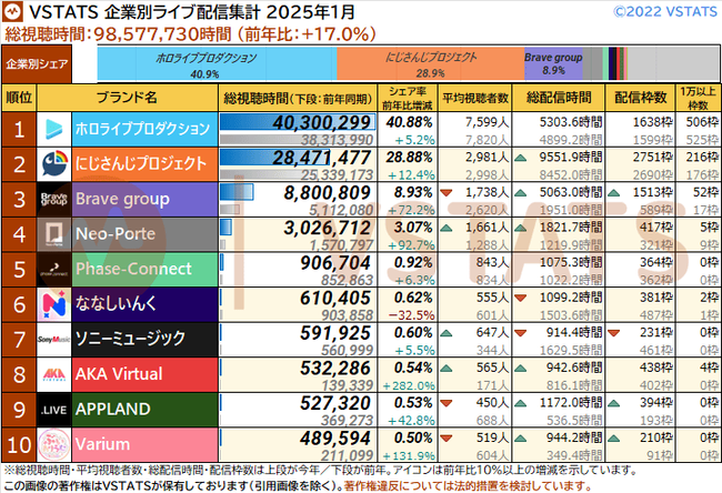(2025年1月 月間の人気配信・チャンネル別登録者増加数・再生増加数はこちら)21時公開 Vtuber業界シェア(総視聴時間基準)】【2025年1月 企業別・ブランド別ライブ配信集計】【2025年1月 Vtuberライブ配信集計( ...