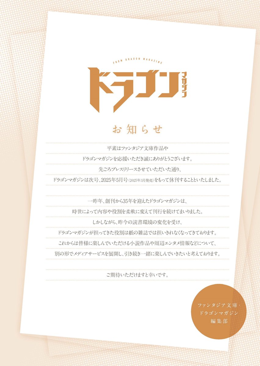 ライトノベルの文芸誌「ドラゴンマガジン」は、今号である 2025年5月号をもって、休