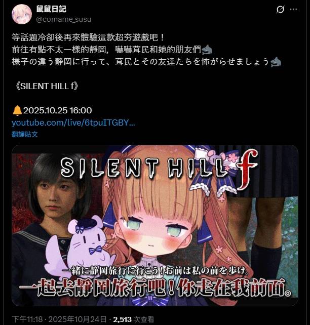 作者 bely (....)標題 [Vtub] 茸茸鼠 遊戲直播 SILENT HILL f 沉默之丘時間 Sat Oct 25 16:14:20 2025