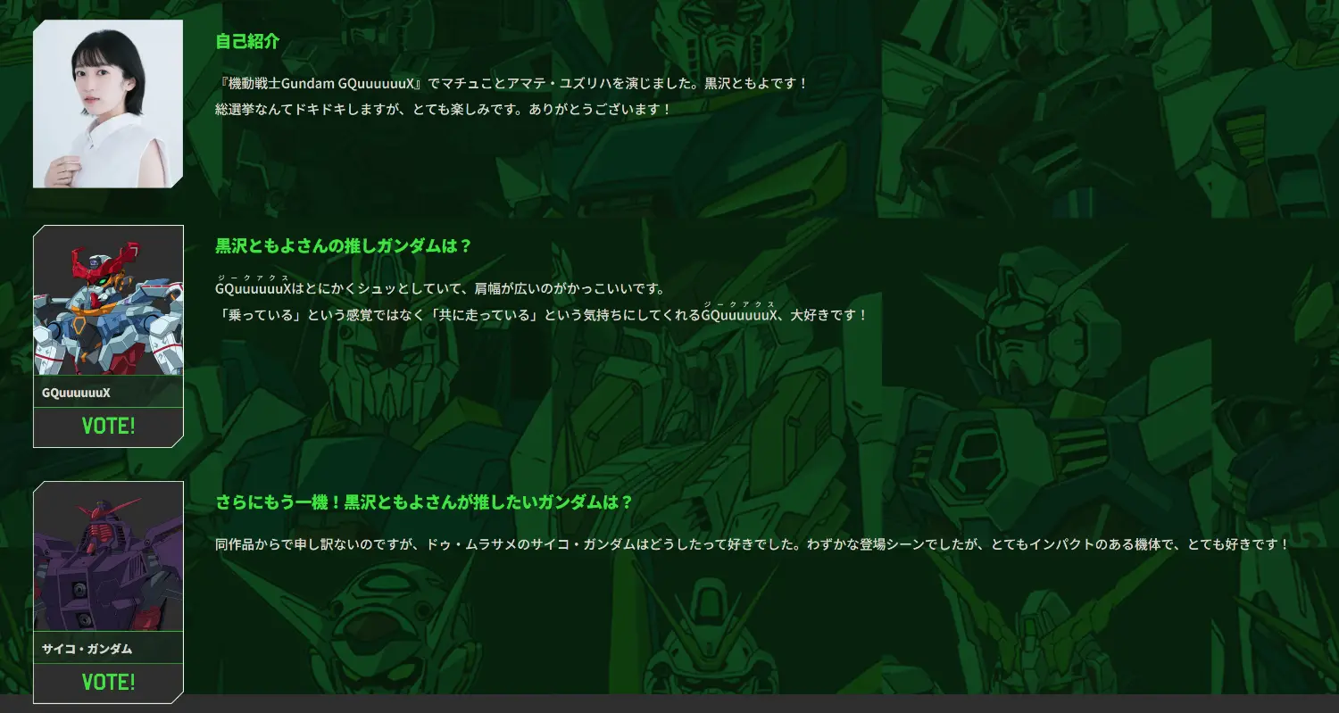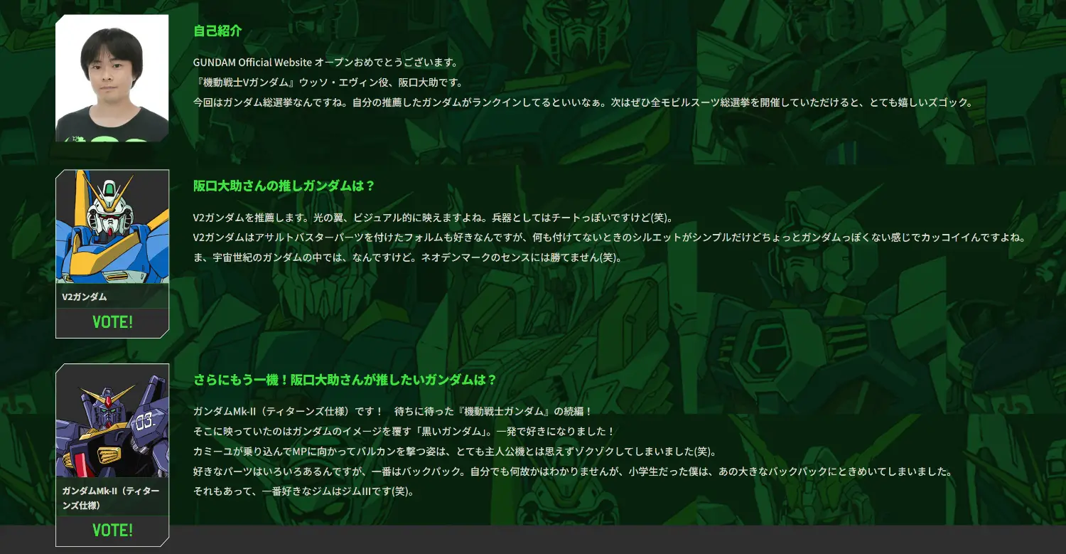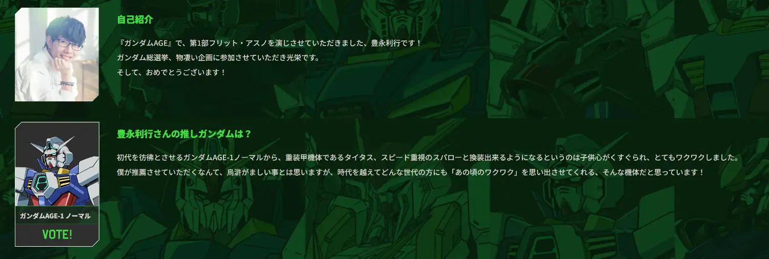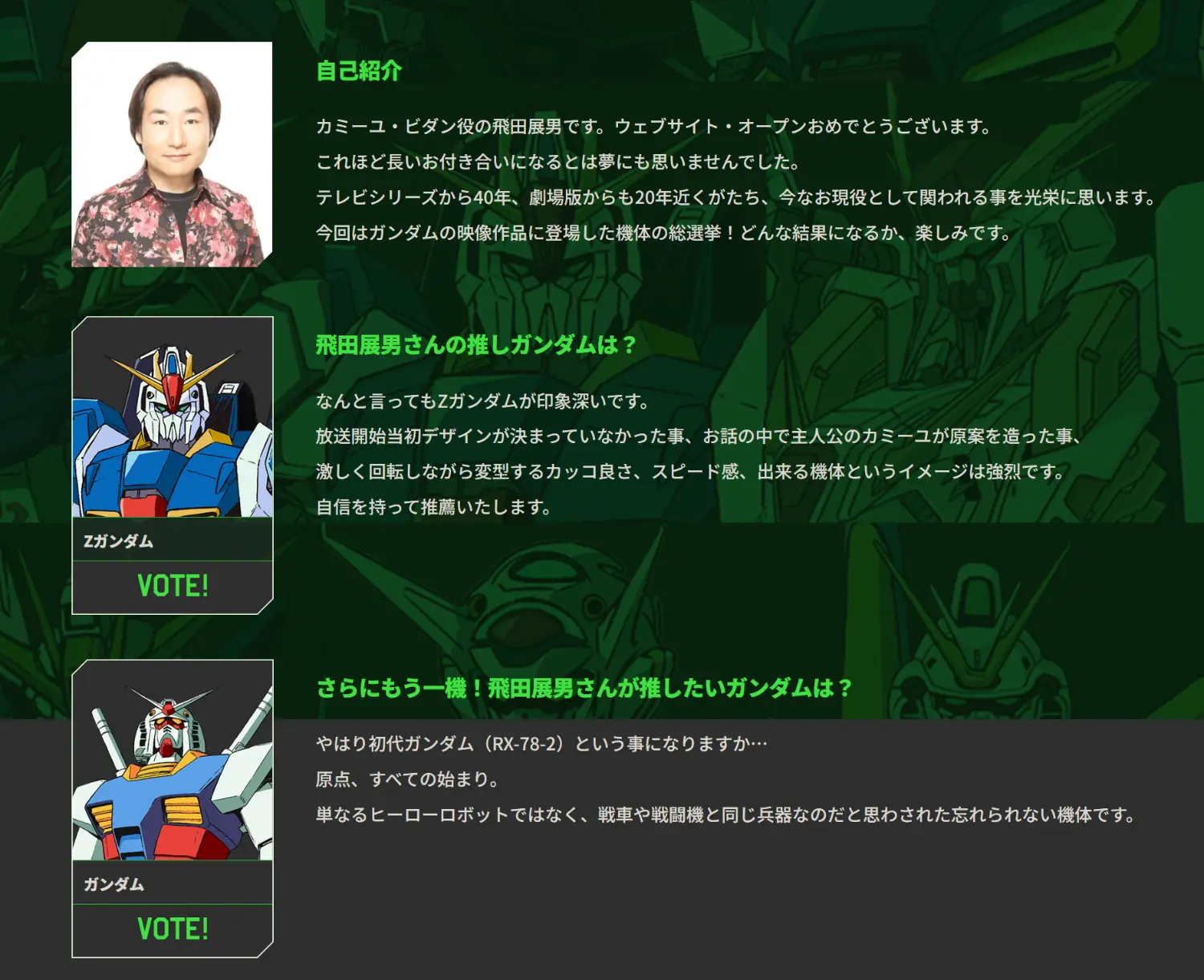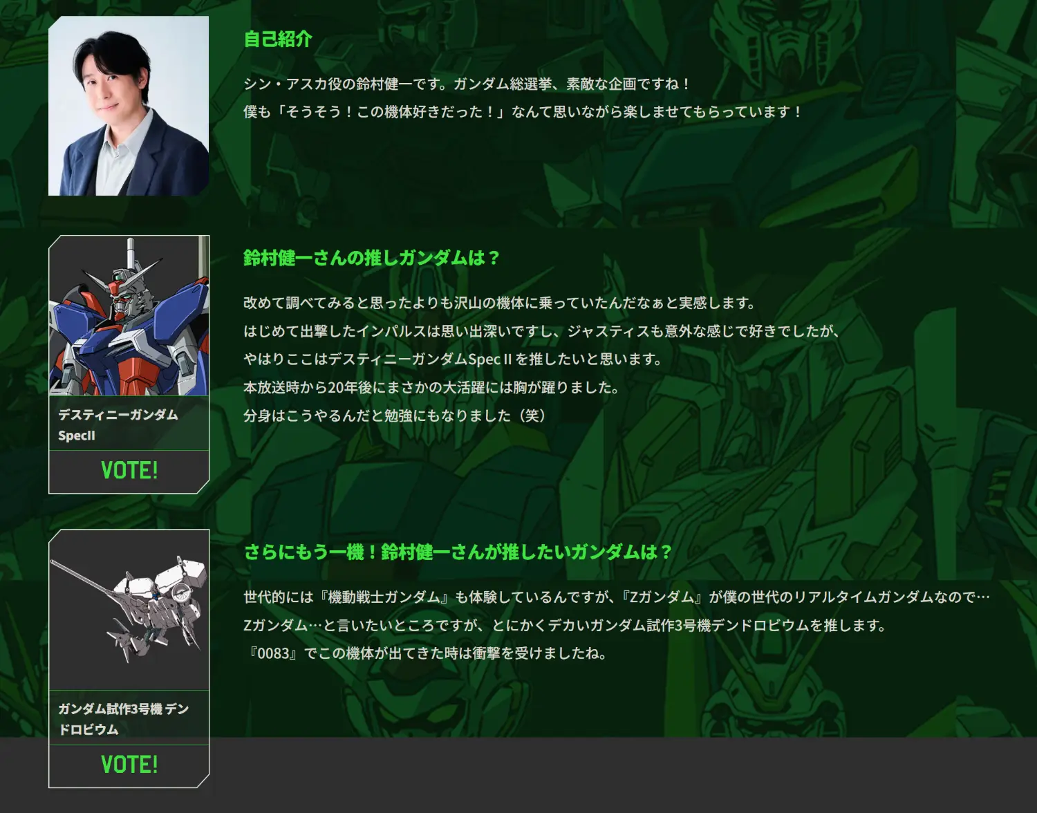 這是個中途計票的推薦(拉票)環節 古谷徹、林原めぐみ、阪口大助、緑川光、鈴村健一、江口拓也等十三名歷屆聲優 給出自己的投票推薦名單 林原惠 ガンダムNT-1 古谷徹 νガンダム 飛田展男 Zガンダム …