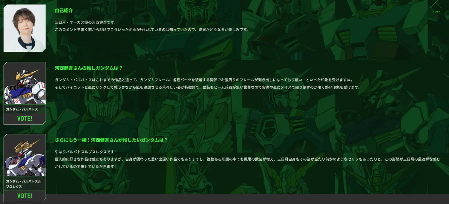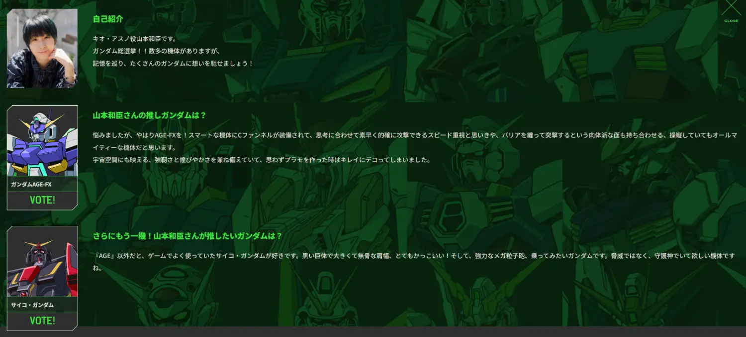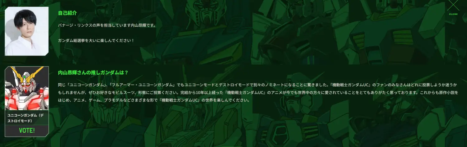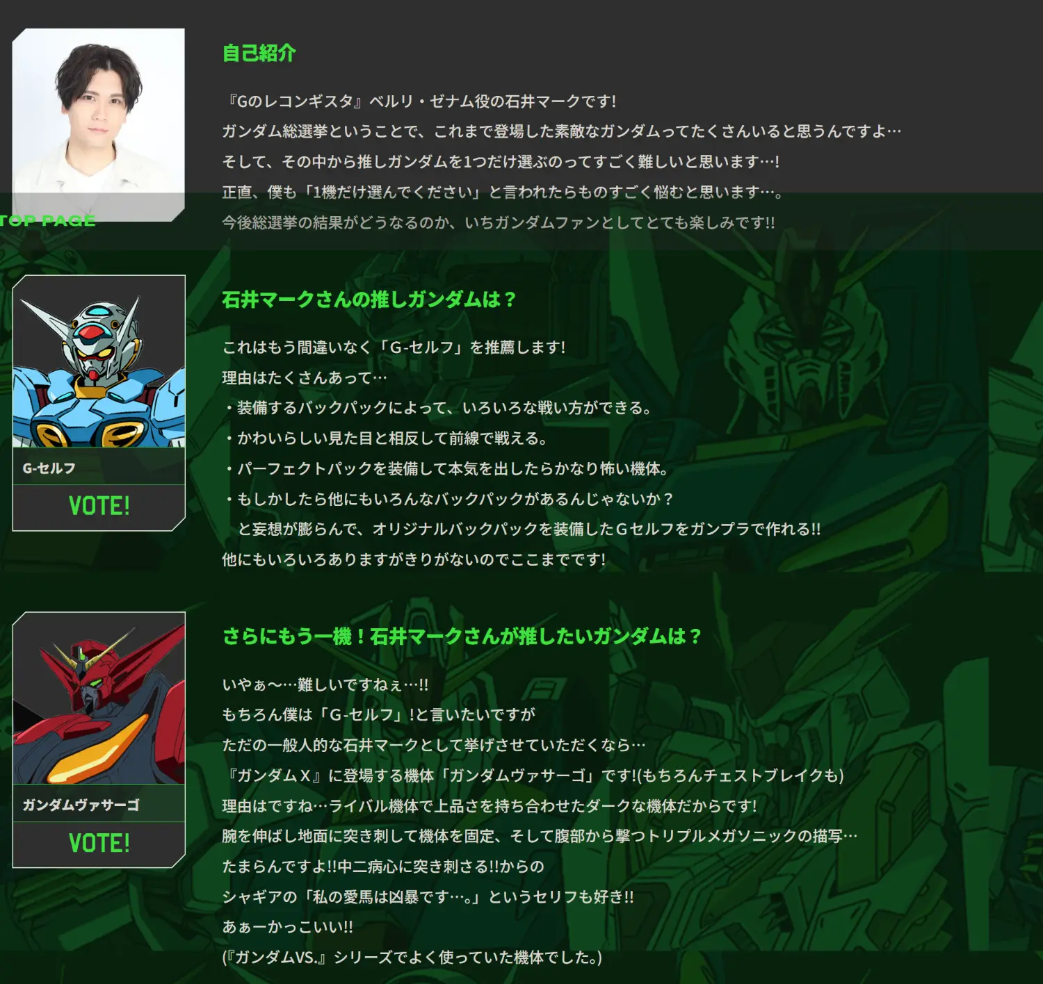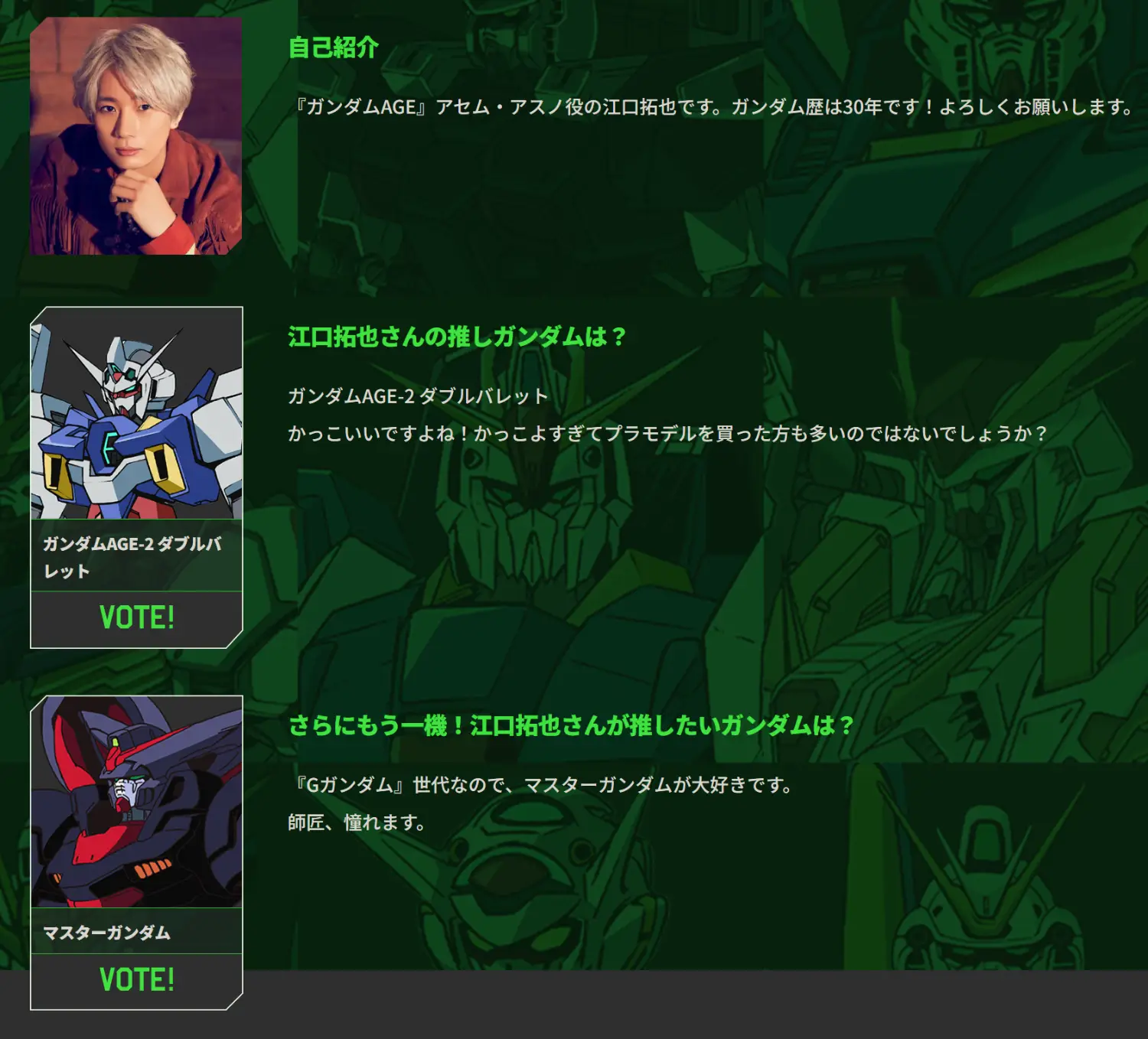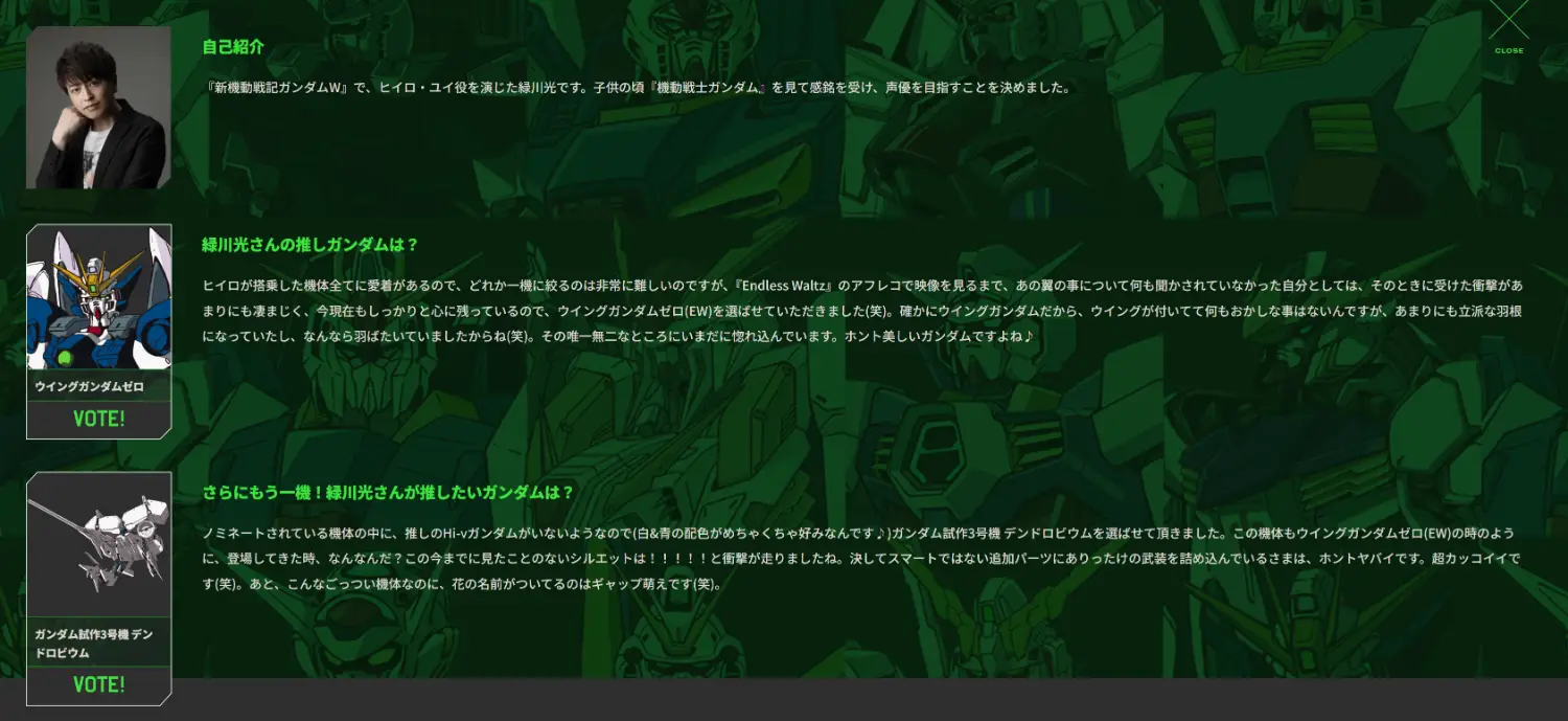 這是個中途計票的推薦(拉票)環節 古谷徹、林原めぐみ、阪口大助、緑川光、鈴村健一、江口拓也等十三名歷屆聲優 給出自己的投票推薦名單 林原惠 ガンダムNT-1 古谷徹 νガンダム 飛田展男 Zガンダム …