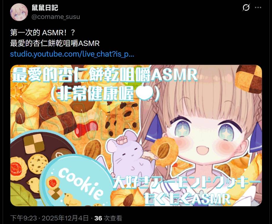 作者 bely (....)標題 [Vtub] 茸茸鼠 【ASMR】最愛的杏仁餅乾咀嚼ASMR(非常健康喔)時間 Thu Dec 4 21:26:47 2025
