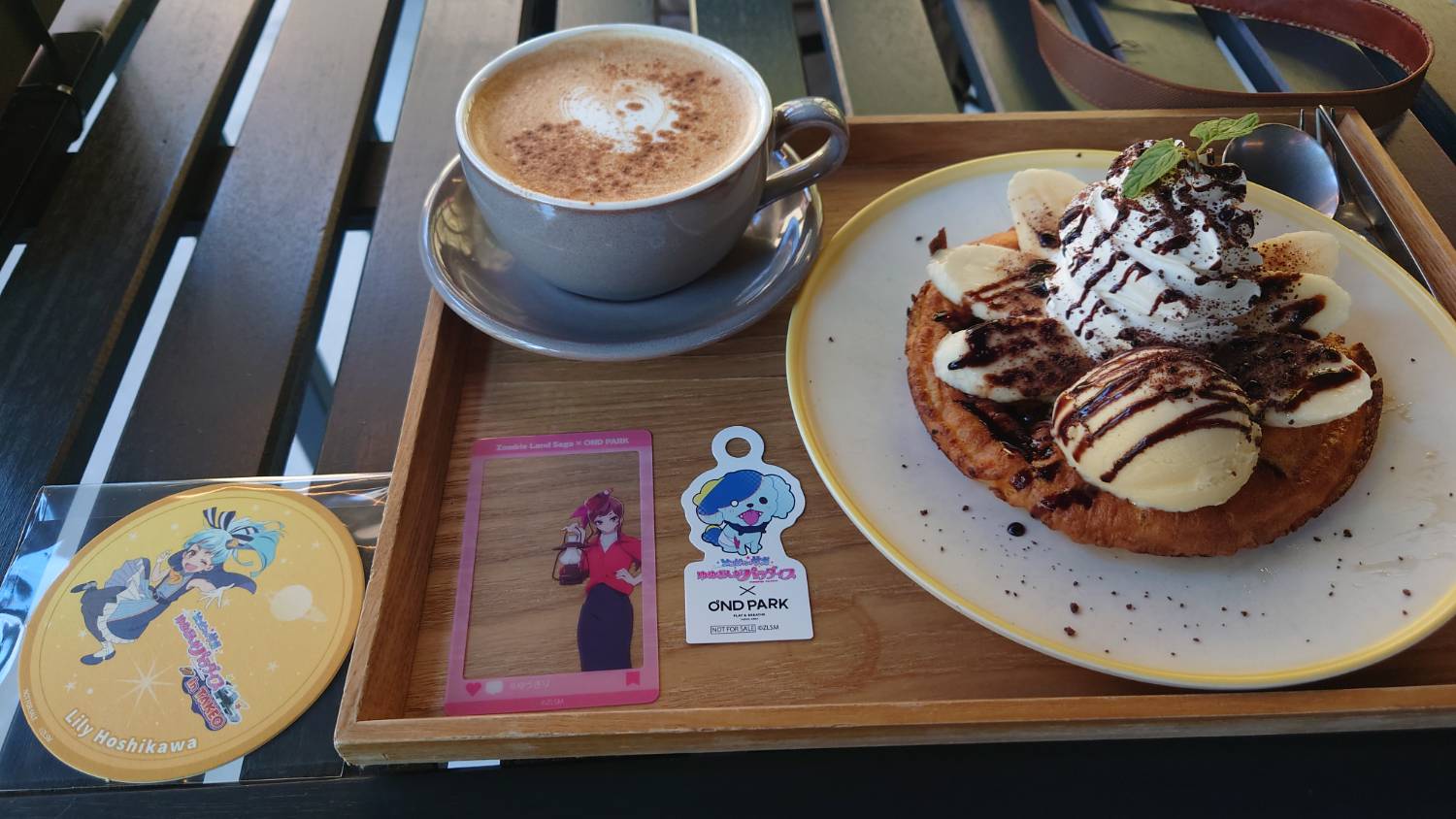 份香蕉巧克力鬆餅+卡布奇諾,消費就有送莉莉的杯墊,我的小卡則是抽到夕霧。