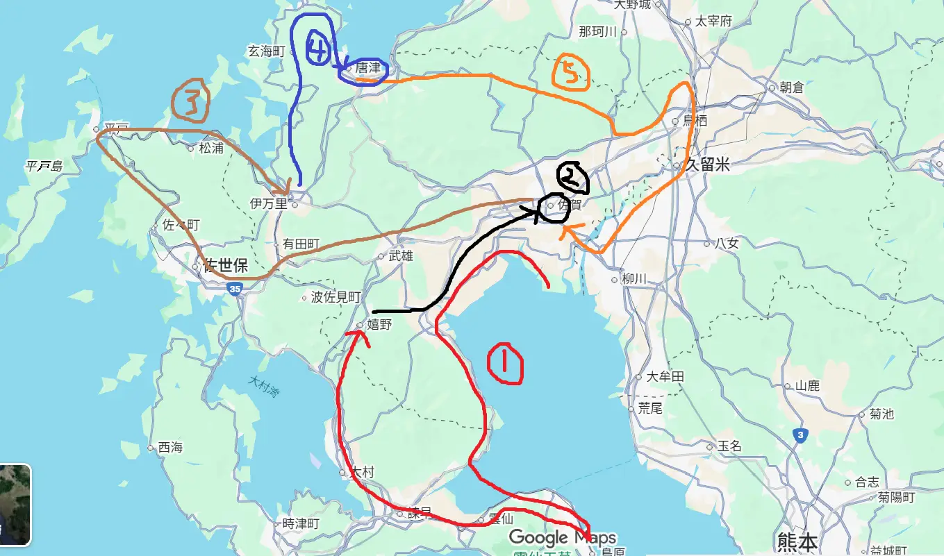 畫的非常醜的本次自駕路線,圖片上面的數字是第幾天。