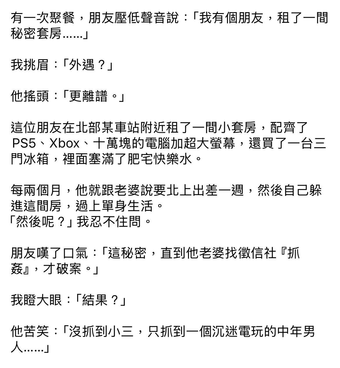 : 之前有個離婚的記得就是會藉口出差跑去自己的小套房