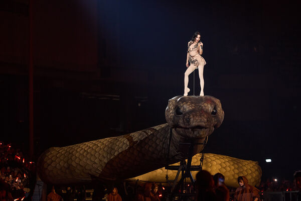 舞台邊出現巨蟒,她直接一腳踏上三層樓高、長30公尺的巨蟒繞整個大巨蛋唱跳《美杜莎
