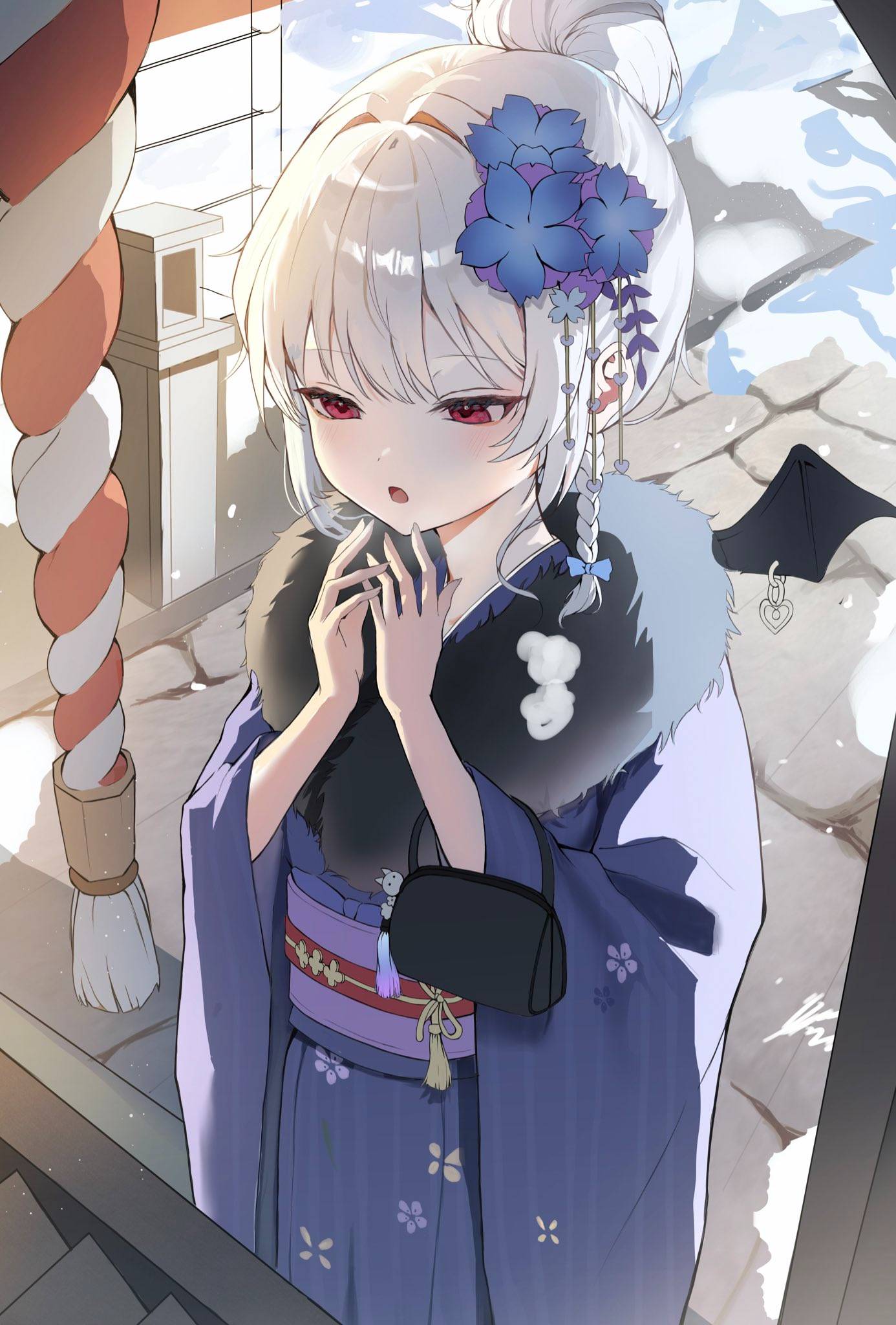 今天的羽留奈穿著一件寶藍色的振袖和服,華麗的布料襯托出她那宛如富家千金般的端正
