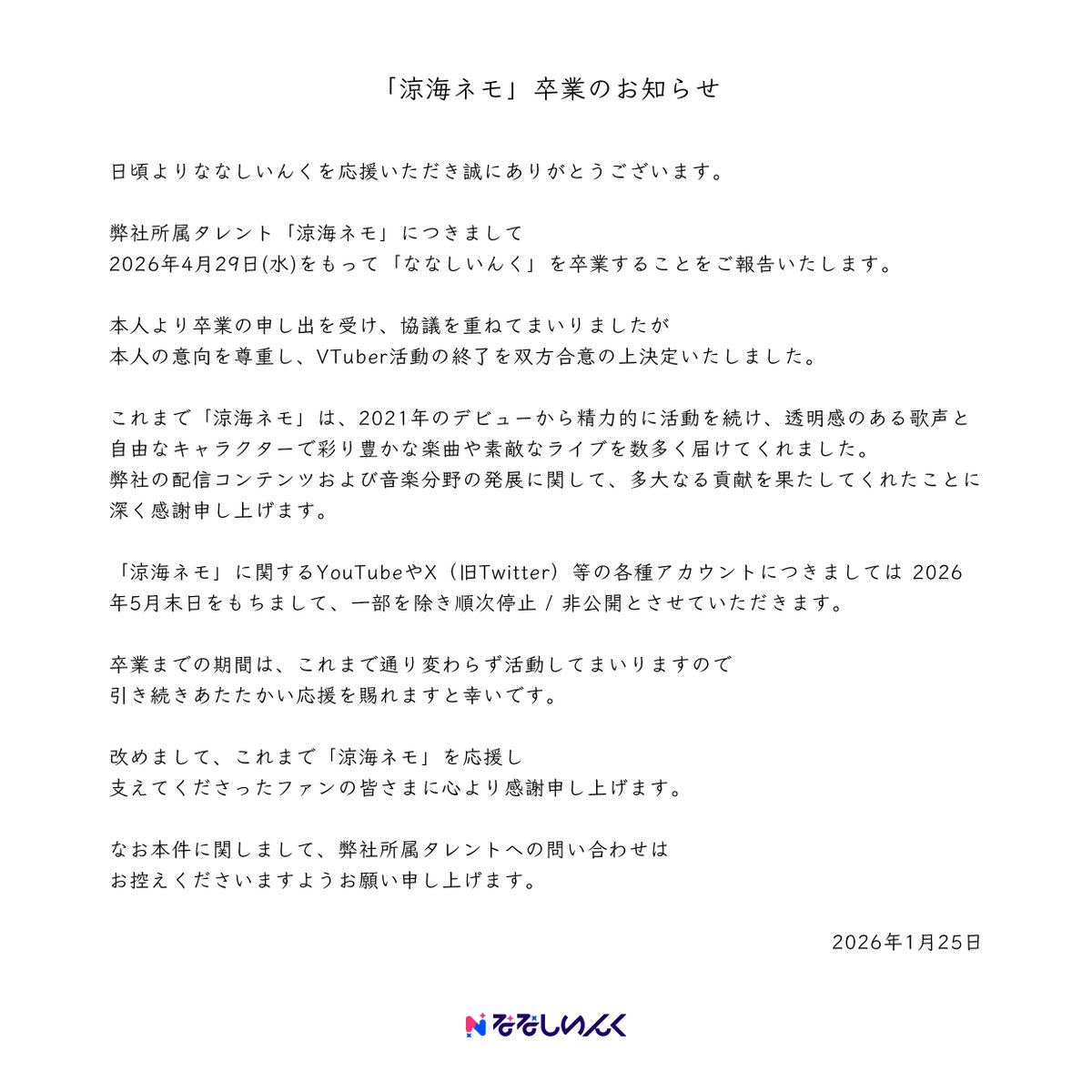 涼海ネモ將於4/29從774inc畢業....