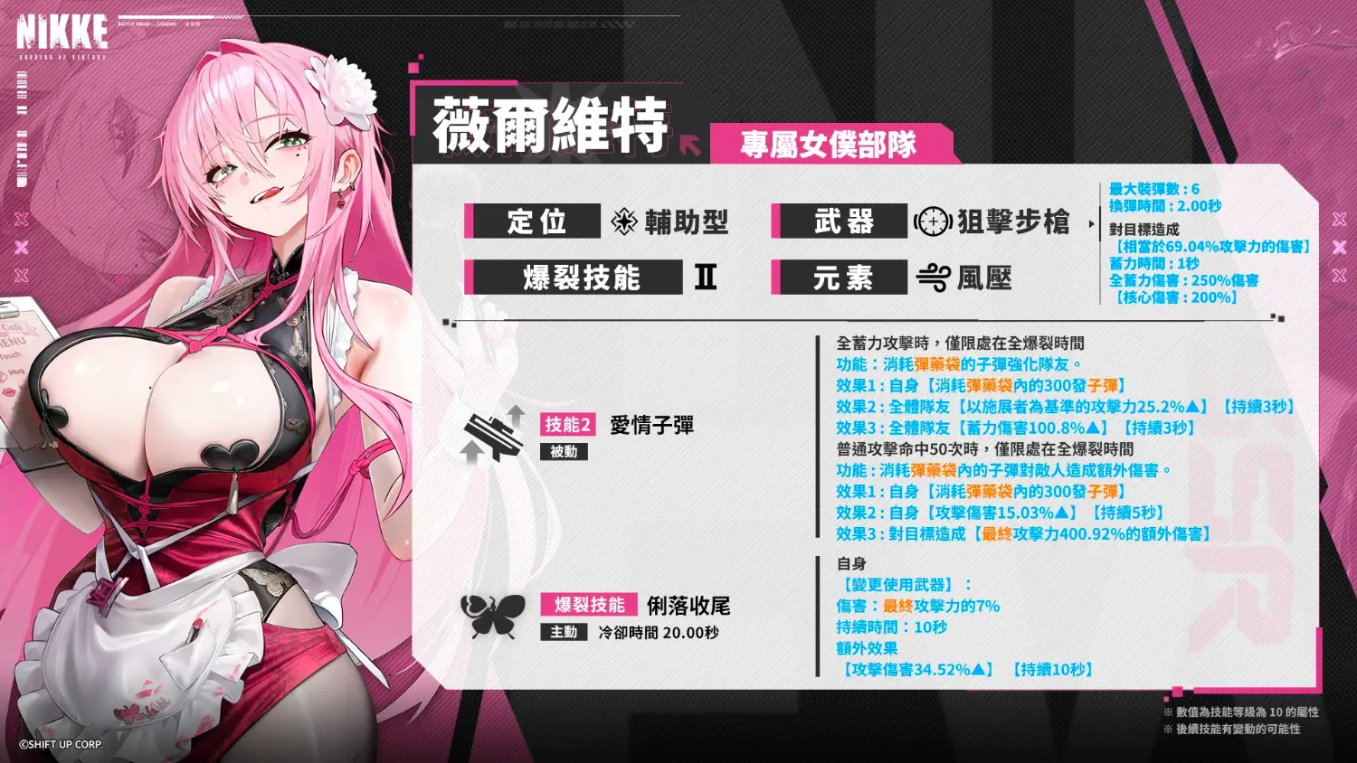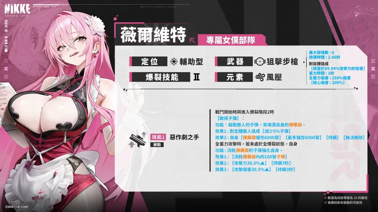 薇爾維特是輔助型妮姬,能透過消耗彈藥袋內的子彈來強化隊友的攻擊能力。