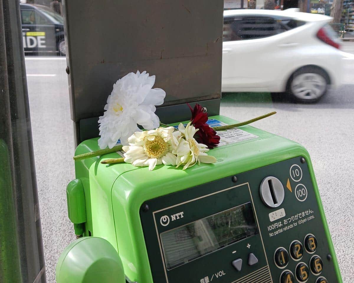 候,電話亭內則擺放著數十朵非洲菊,有的仍包裝完整,有的甚至插在裝滿水的寶特瓶中
