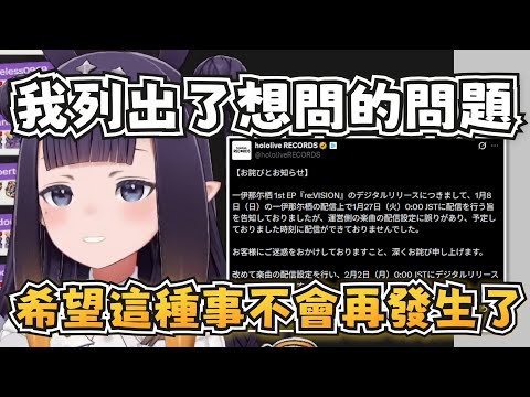 Ina 回應了EP發行延期的事件,這次出包不是她的錯,也不是經理人的錯,是營運的鍋。為了防止新的發行日期(2月2日)又跳票,ina三番四次的向營運確認進程,並要求他們把進程中的所有收條都發送給她看 ww 她苦笑說自己也不想做到這個地步,不過大家都懂的...