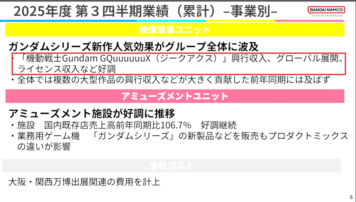 公司表示,成長主因包括新影像作品《機動戰士Gundam GQuuuuuuX》帶動話題,