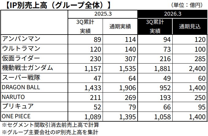 萬代南夢宮控股(7832)公布了第3季按IP別計的銷售額,