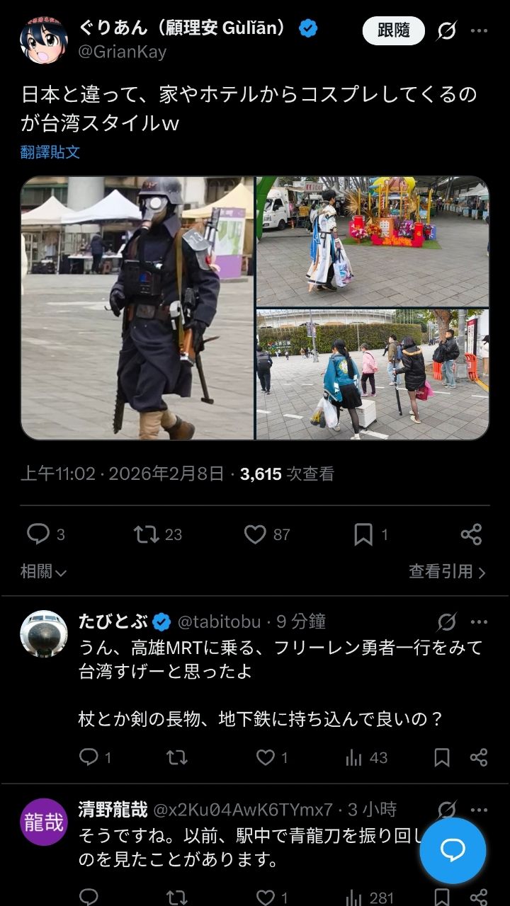 作者 GTES (GTES)標題 [討論] 日本人:台灣人都直接穿cos服到會場時間 Sun Feb 8 17:01:44 2026