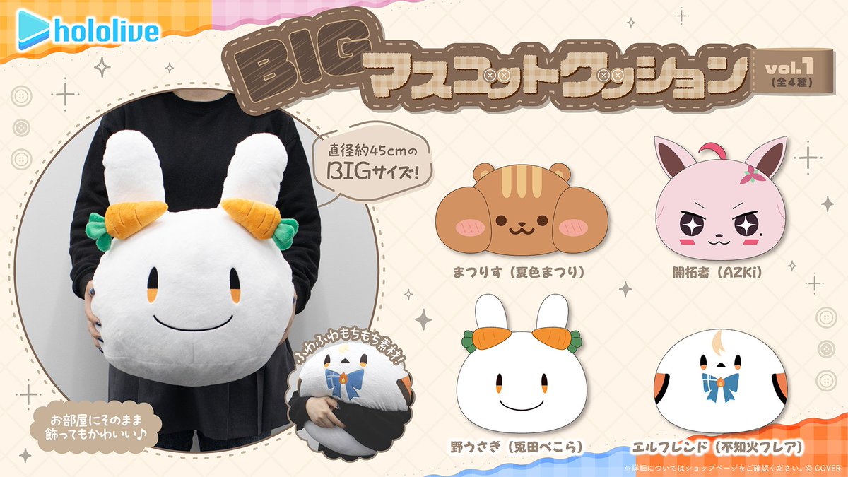 Your favorite hololive mascots are here, and they're BIG! Big cushions, that is! Hug them! Display them! Experience their soft, cuddly feel for yourse ...