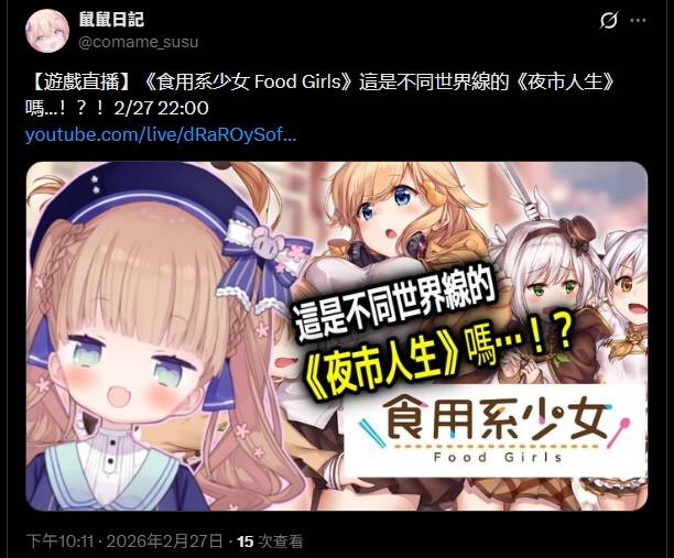 作者 bely (....)標題 [Vtub] 茸茸鼠 遊戲直播 食用系少女 夜市人生? Food Girls時間 Fri Feb 27 22:20:27 2026