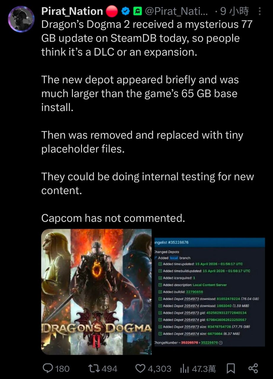 steamdb上有人看到,DD2在很短的時間內出現了一組77G的超大更新檔