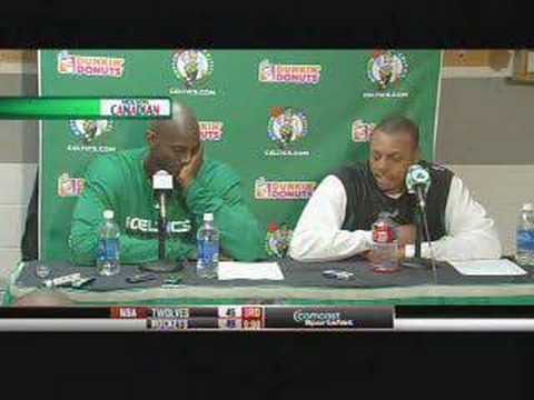 PP在讚美KG改變了球隊 結果KG居然手一伸去阻止PP講話有時候這兩個人很像小孩子在打鬧....