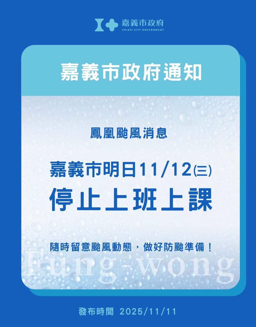 嘉義市11/12(星期三)停止上班、停止上課
